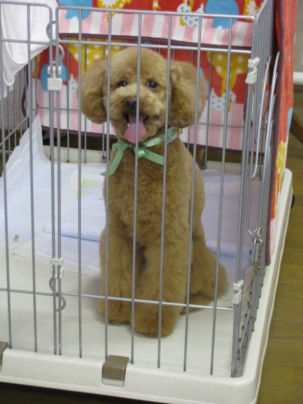 ママのお迎えを待っている間、ゲージの中で