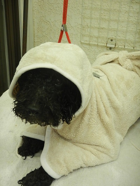 朝はキャバリアのラブちゃんがお手入れに雨の中