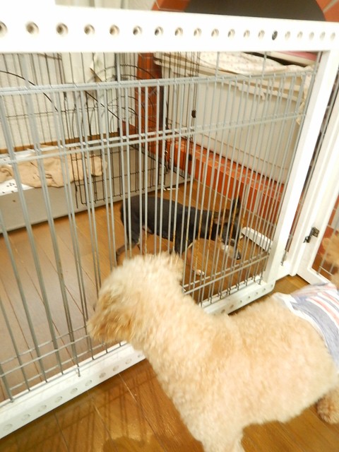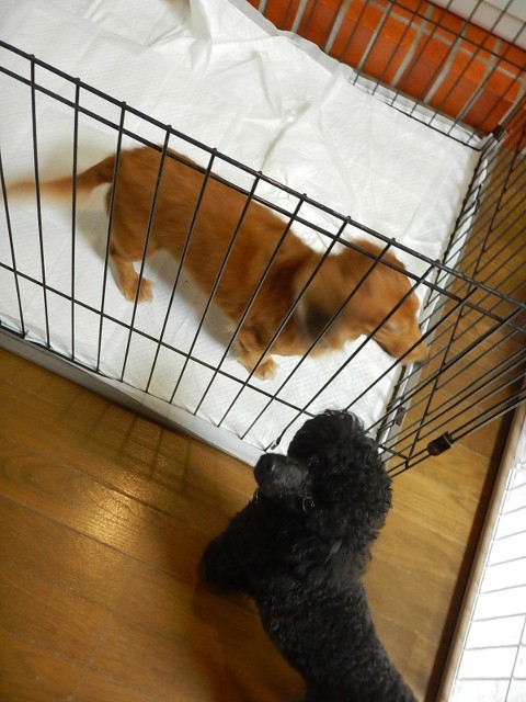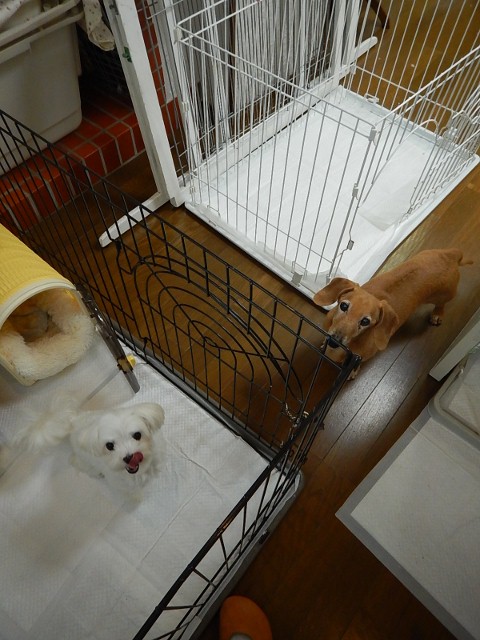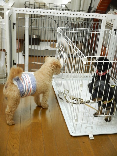 フェンス越しにレミちゃんやマロちゃんに一生懸命アソボーのご挨拶して